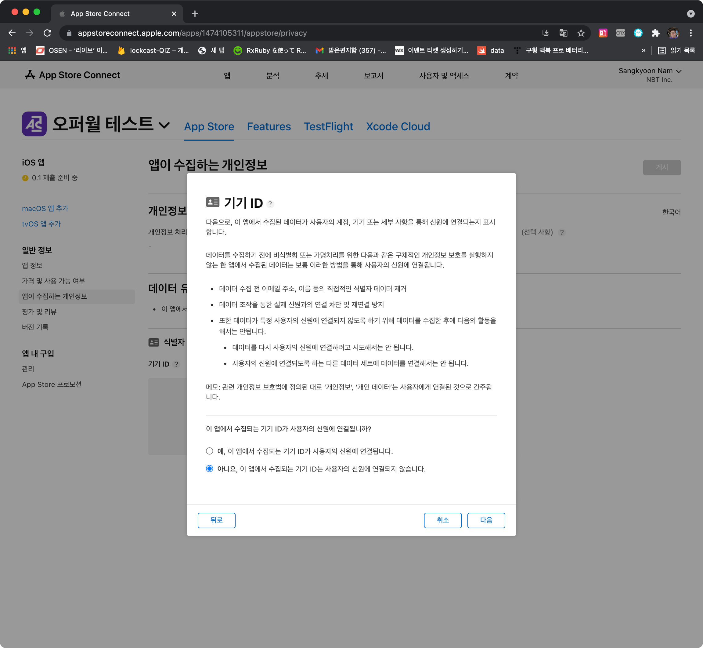 iOS 앱을 검수요청한 경우 아래와 같이 NSUserTrackingUsageDescription 추가하여 앱이 수집하는 개인정보를 수정합니다.