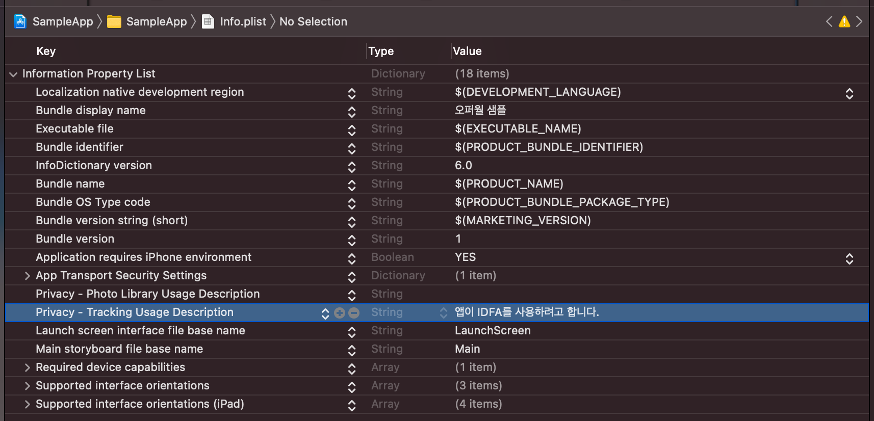 스크롤 다운하여 Privacy - Tracking Usage Description을 선택합니다.
